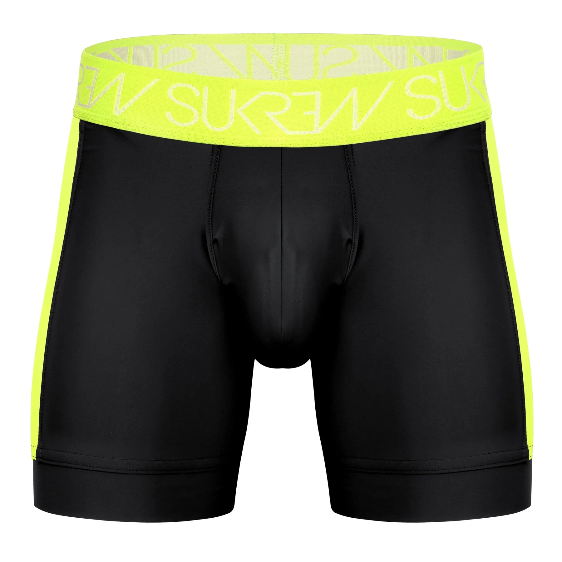 The bold Underground Black and Acid Yellow colourway demands attention, while the spacious contoured pouch keeps you comfortable and supported. Unlined construction gives you maximum stretch, and sheer mesh side panels add a cheeky visual edge. The leg opening is soft and flexible, moving seamlessly with your body throughout the day. Finished with a chunky 5cm jacquard waistband in Acid Yellow and White that proudly displays the SUKREW brand.